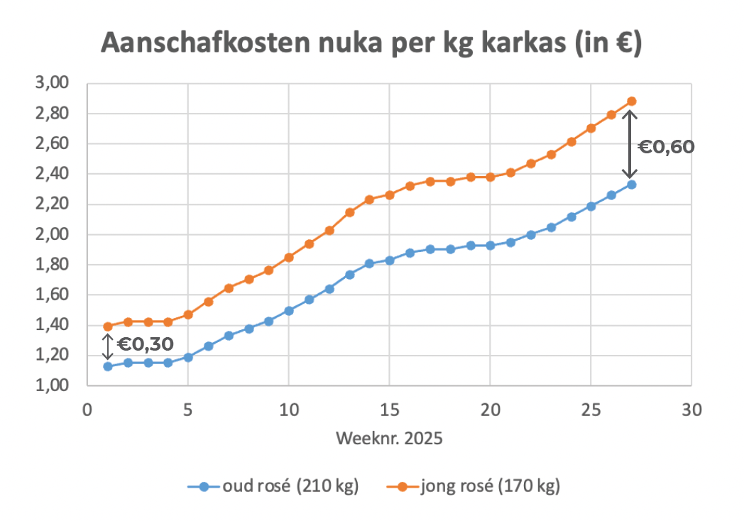 Ook oud rosé heeft te maken met duurdere nuka’s, maar voor deze categorie pakt de rekensom gunstiger uit. Omdat oud rosé op een oudere leeftijd wordt geslacht, tikken de aanschafkosten van een nuka minder hard door in de geslachte kilo’s. Begin 2025 was het aandeel nuka-kosten ongeveer 1,10 euro per kilo karkas. In juli 2025 is dit voor oud rosé opgelopen tot 2,30 euro per kilo. Het voordeel voor oud rosé - ten opzichte van jong rosé - is hiermee opgelopen van 30 cent per kilo karkas in januari tot 60 cent in juli (zie grafiek). Dit verschil kom niet tot uiting in een hogere uitbetaalprijs van jong rosé.