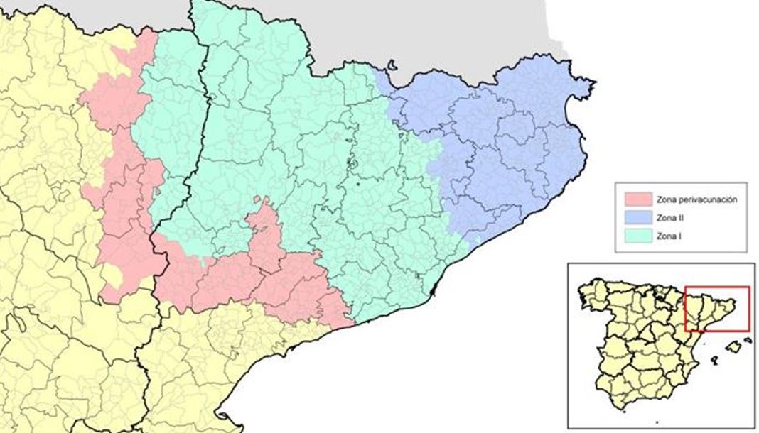 De beperkingszone van 50 km rond rond de haarden wordt aangemerkt als vaccinatiezone II (donkerblauw op kaart). Het gebied ten westen daarvan wordt aangeduid als vaccinatiezone I (lichtblauw op kaart). In het Catalaanse deel van deze vaccinatiezone zijn 2.164 runderbedrijven aanwezig met een geschatte veestapel van 369.323 runderen. In de provincie Aragon gaat het om 685 bedrijven met 86.386 runderen. De uitvoering van het programma gaat gepaard met beperkingen op dierverplaatsingen en extra toezicht.