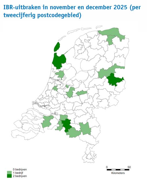 In Nederland is het aantal uitbraken van IBR op rundveebedrijven in de laatste maanden van 2025 onverwacht sterk toegenomen. Terwijl tot eind oktober slechts dertien IBR-vrije bedrijven met een besmetting te maken kregen, liep dit aantal in november en december op met nog eens vijftien nieuwe gevallen.