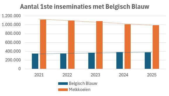 Waar het aantal eerste inseminaties van melkkoeien jaarlijks afneemt, neemt het aantal inseminaties met Belgisch blauwe stieren toe. In 2021 werden er 1,12 miljoen eerste inseminaties uitgevoerd waarvan 346.500 met Belgisch blauw. In 2025 is het aantal eerste inseminaties gedaald naar 992.300, maar is het aandeel Belgisch blauw gestegen naar 378.400.