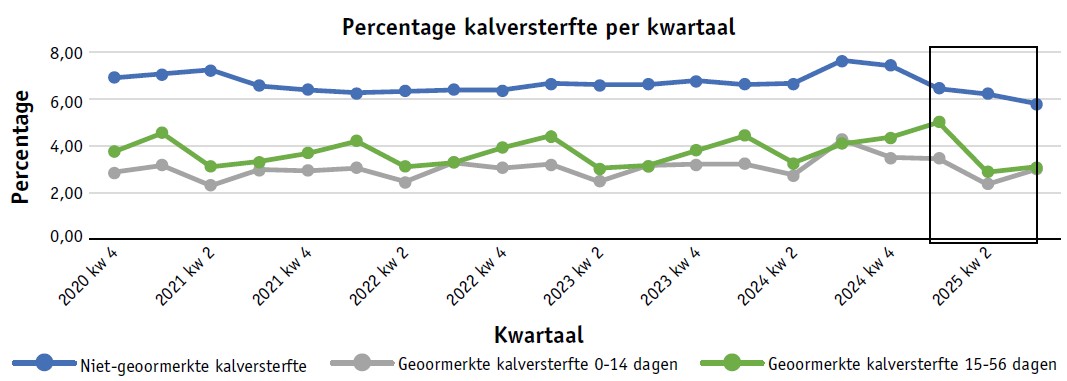 De kalversterfte op melkveebedrijven is in 2025 duidelijk gedaald, vooral in het tweede en derde kwartaal van het jaar. Dat blijkt uit de nieuwste data-analyse binnen de Diergezondheidsmonitoring Rund. Zowel de sterfte onder geoormerkte als niet-geoormerkte kalveren liet in deze periode een afname zien.